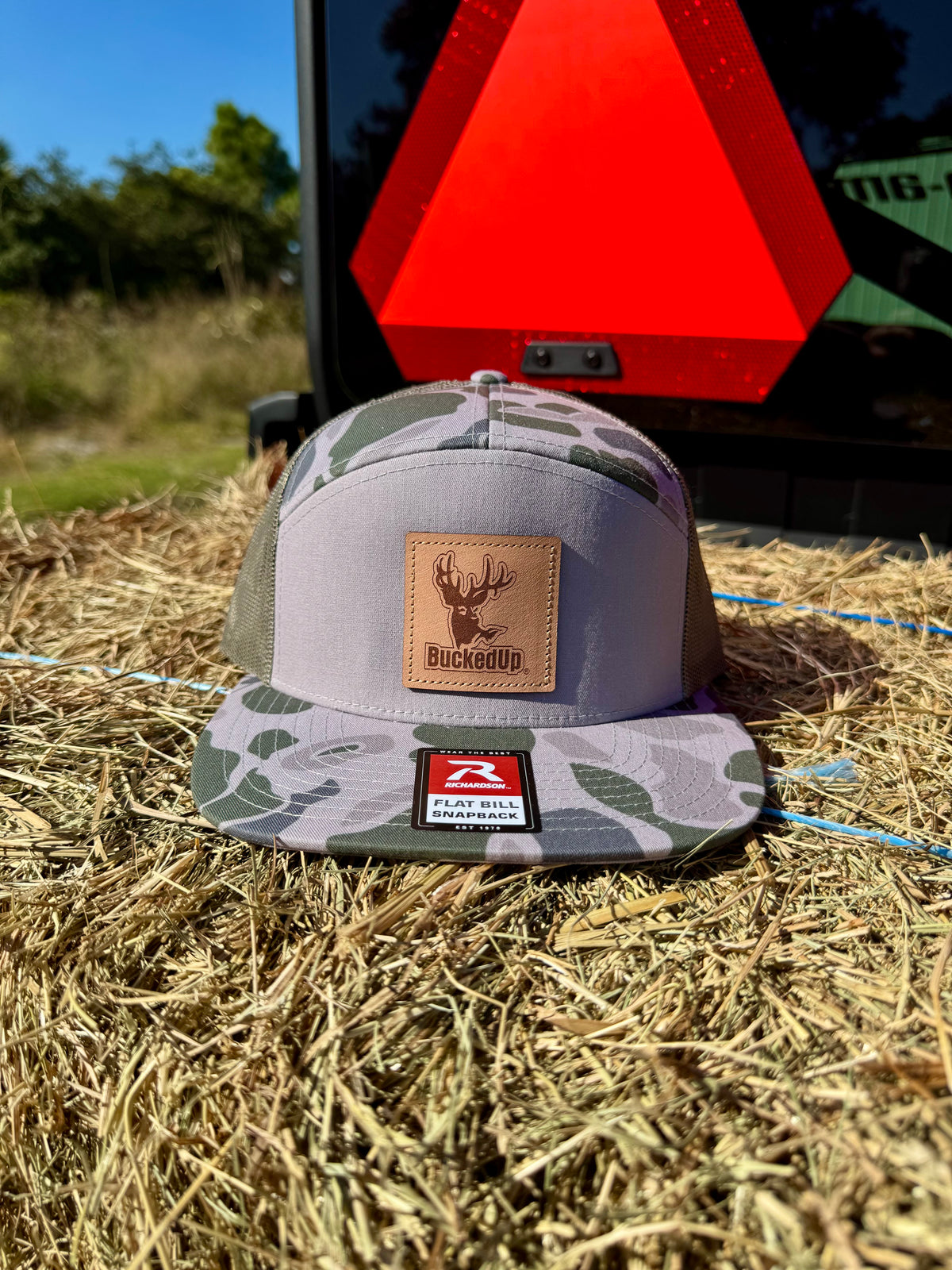 BuckedUp Richardson 7 Panel Hi Profile leather patch snapback in Gray Camo with green mesh back.