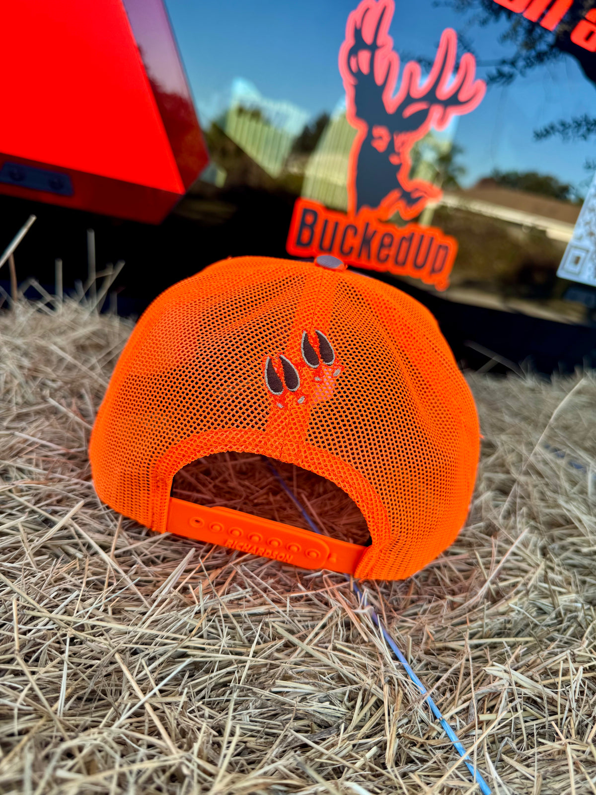 BuckedUp Richardson leather patch snapback in Orange Duck Camo with orange mesh back.