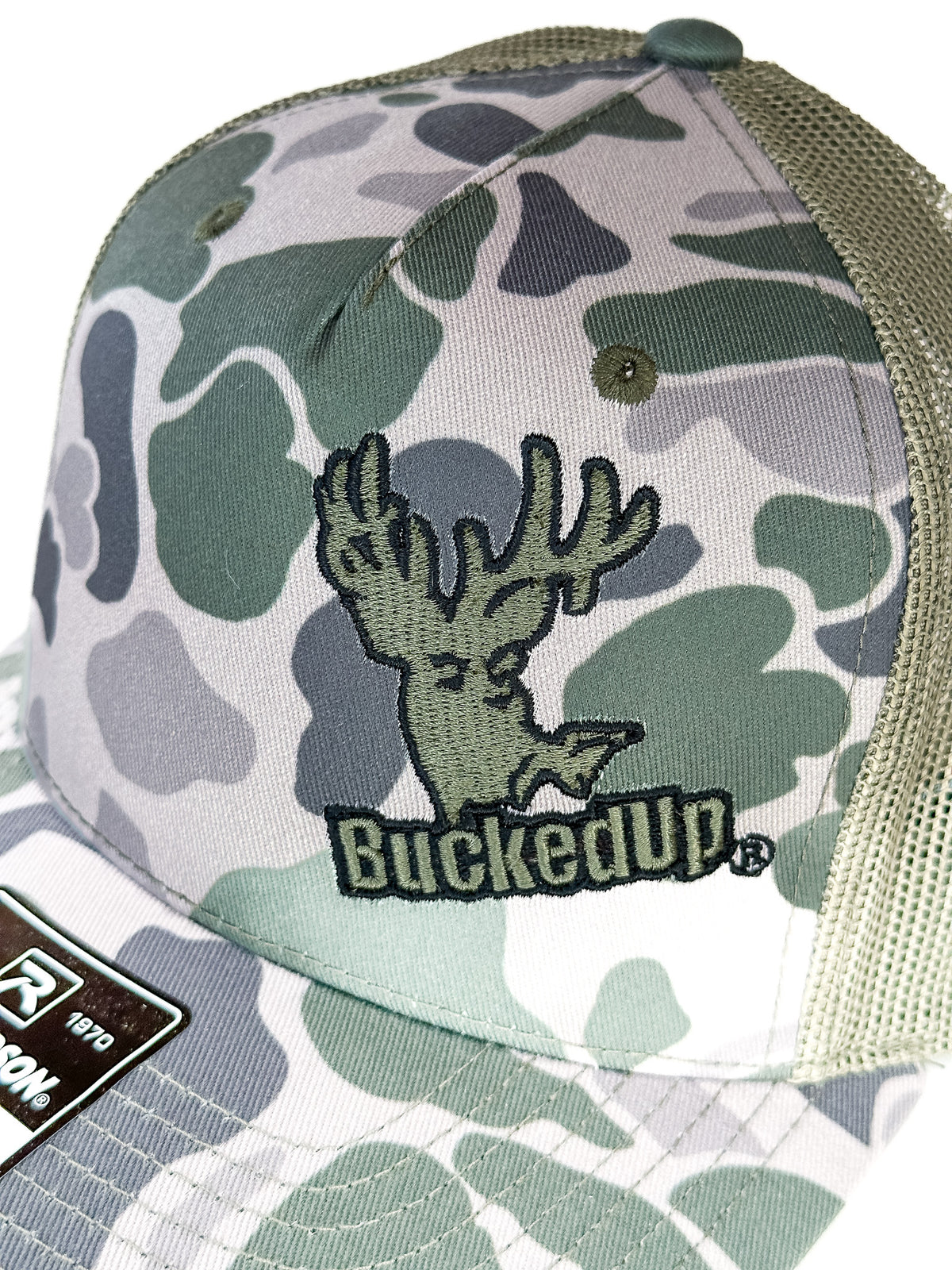 Richardson 112 BuckedUp® Logo in Buck Camo and green mesh snapbacks.