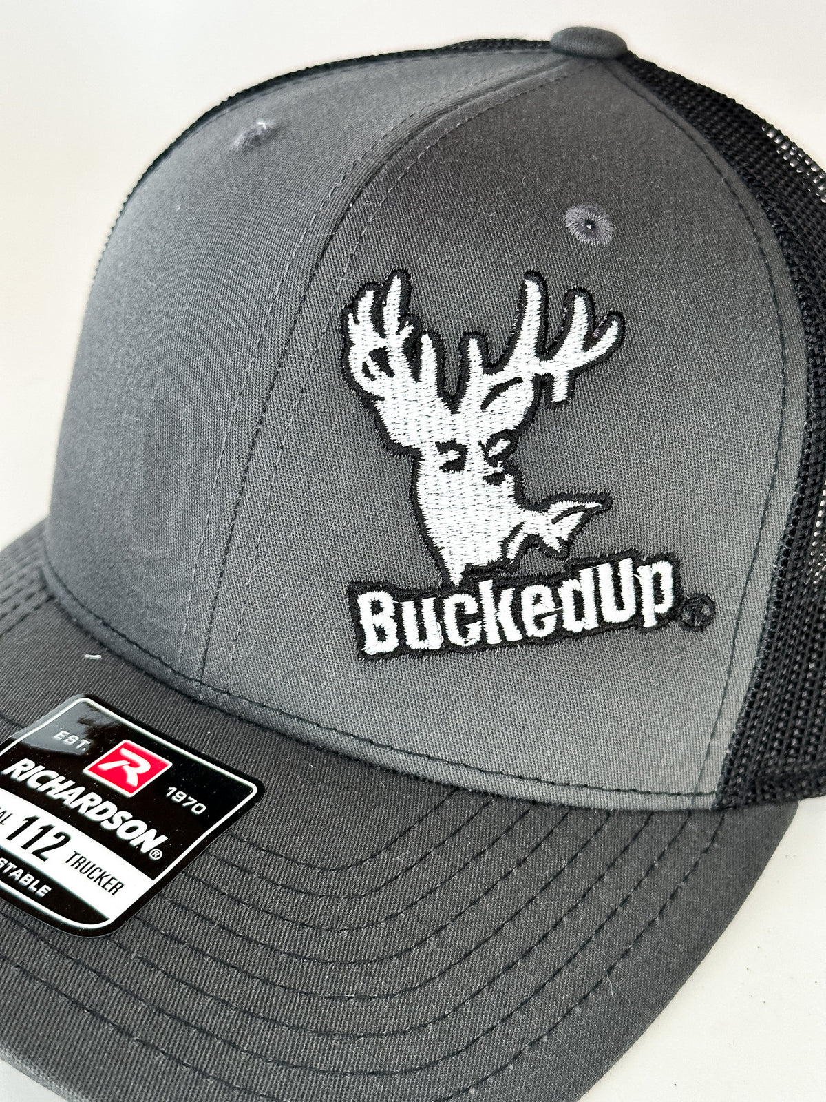 BuckedUp® Dark Gray Logo White with Black Mesh Snapback