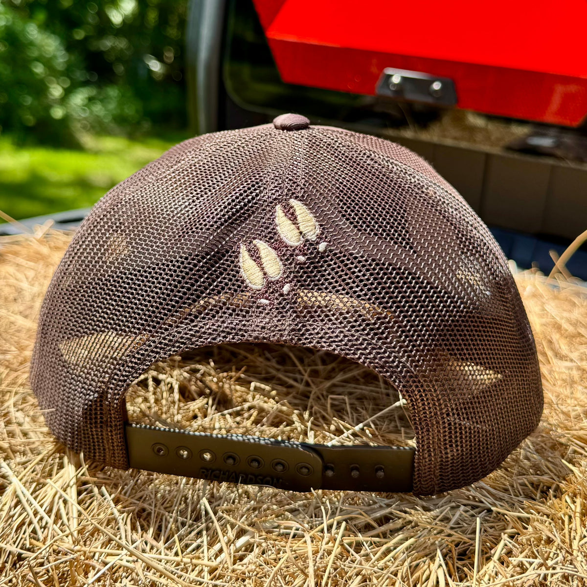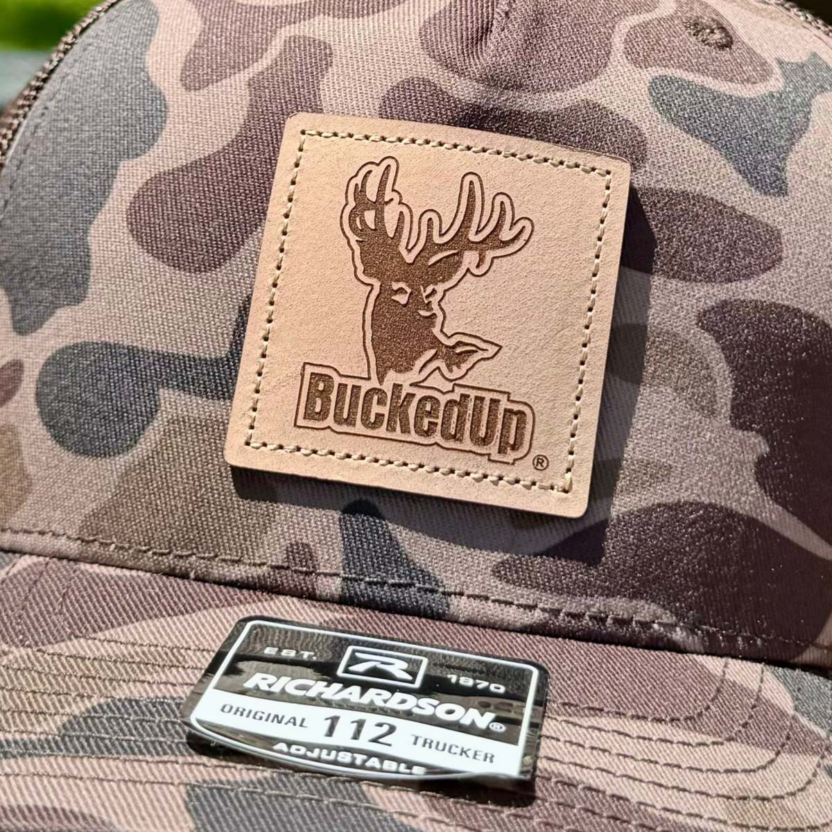 BuckedUp Richardson 112 leather patch snapback in Bark Duck Camo with brown mesh back.