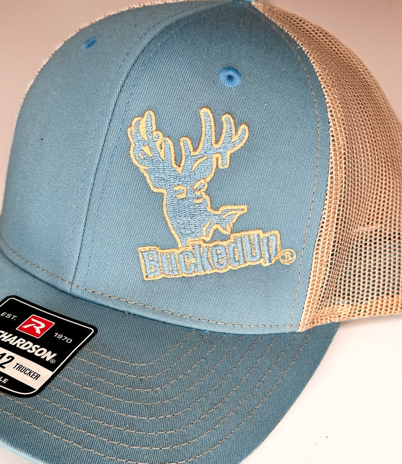 BuckedUp® Blue Logo Blue with Tan Mesh Snapback