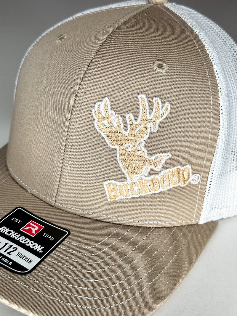 BuckedUp® Tan Logo Tan with White Mesh Snapback